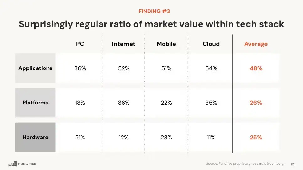 If Fundrise’s chart is any clue, across every tech cycle nearly half the value ultimately shifts to the application layer: AI is just following the same curve.