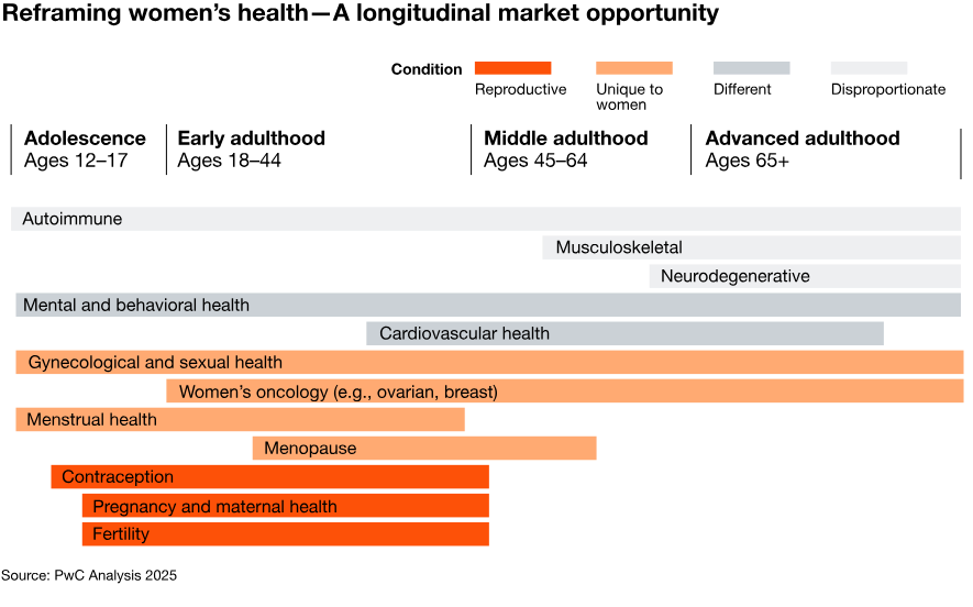 💊 The $600 billion market that’s still being undercounted. PwC put the women’s health market at $430-440 billion today, growing to $600 billion by 2030, and then admitted that even that was probably an underestimate. Some great charts in this report include one that maps women’s health across a whole lifetime and reveals what’s been missed: autoimmune conditions starting in adolescence, cardiovascular risk through midlife, neurodegenerative into advanced age. We went deep on this.